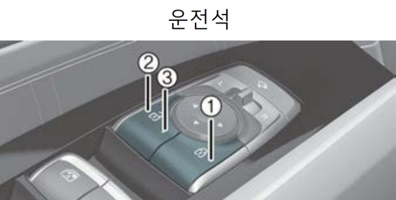 동승석 전후 위치 조절은 ①, ③ 버튼으로 가능합니다. ① 버튼을 누르면 앞으로 이동하고 ③ 버튼을 누르면 뒤로 이동합니다. 동승석 각도 조절은 ②, ④ 버튼으로 가능합니다. ② 버튼을 누르면 앞으로 접히고 ④ 버튼을 누르면 뒤로 펼쳐집니다.