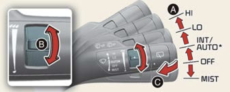| AUTO | 차 안 중앙 앞유리 상단에 설치된 센서 (A)에서 비의 양을 감지하여 비의 양이 많아지면 와이퍼 작동 속도가 빨라지고, 비의 양이 적어지면 느려지다가 비가 멈추면 작동도 멈춥니다. 와이퍼 속도는 속도 조절 노브 B를 돌려 조절할 수 있습니다. 위쪽으로 돌리면 속도가 빨라지며 아래쪽으로 돌리면 속도가 느려집니다. |