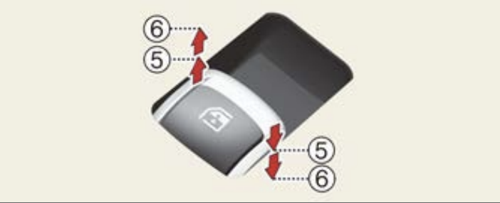 해등 유리창 개폐 스위치를 첫 번째 걸리는 위치 ⑤까지 누르거나 당기면 해당 유리창이 열리거나 닫힙니다. 유리창 개폐 스위치를 한 번만 강하게 두 번째 걸리는 위치 ⑥까지 당겨주거나 눌러 주면 스위치에서 손을 떼어도 유리창이 완전히 닫히거나 열립니다.