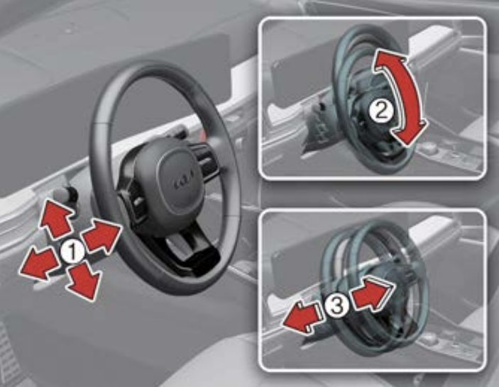 조절 스위치 ①을 이용하여 스티어링 휠의 ② 높낮이와 ③ 앞뒤 위치를 조절할 수 있습니다.