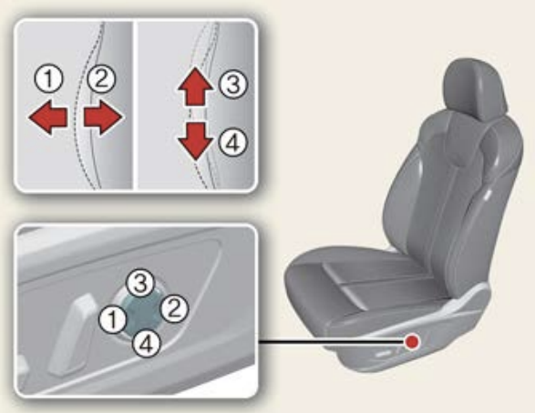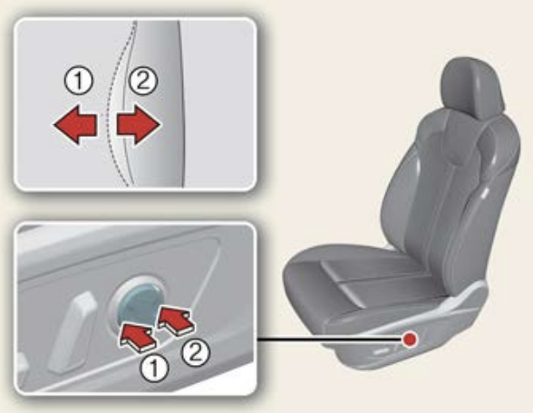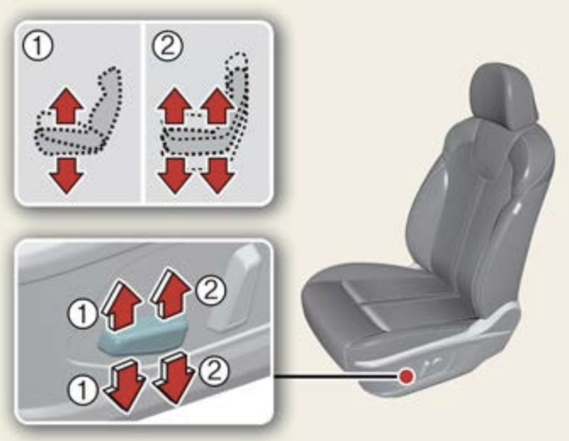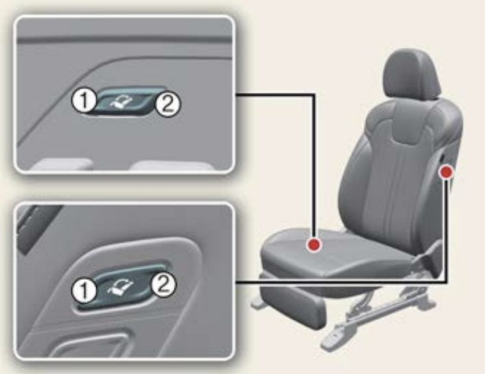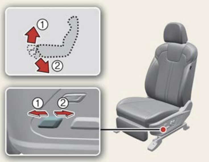 조절 스위치의 앞쪽①을 올리거나 내리면 좌석의 앞부분이 올라가거나 내려옵니다. 조절 스위치를 조작하다 멈추면 시트 이동이 중지됩니다.