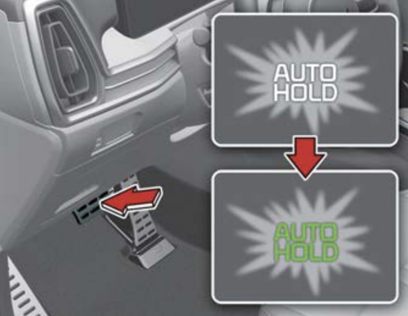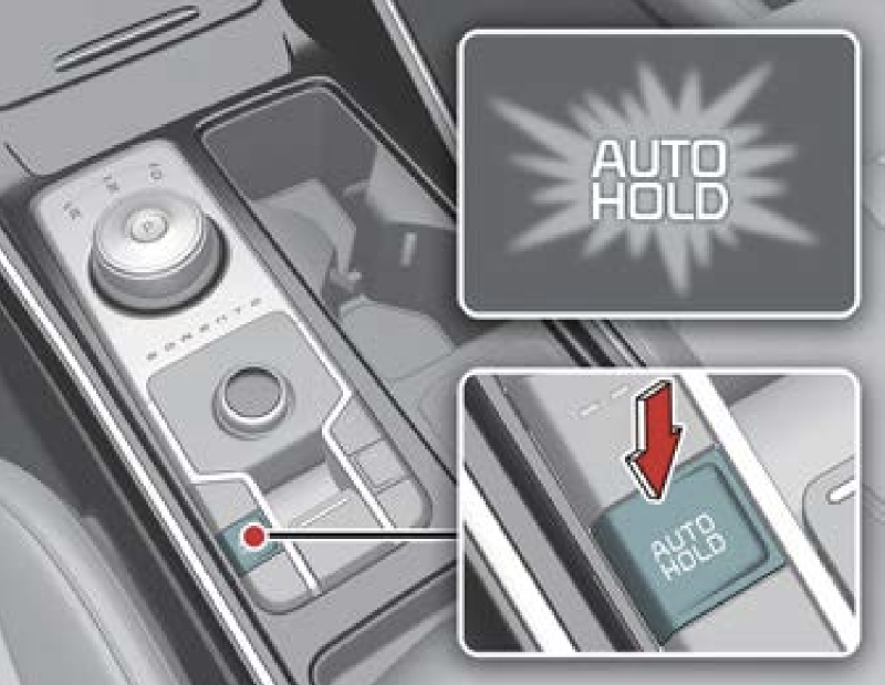 자동 정차 기능 작동 스위치를 누르면 클러스터에 흰색 [AUTO HOLD] 표시등이 켜지고 자동 정차 기능은 작동 대기 상태가 됩니다. 주행 중 브레이크 페달을 밟고 차량이 멈추면 자동 정차 기능이 작동되면서, [AUTO HOLD] 표시등이 흰색에서 녹색으로 바뀝니다.