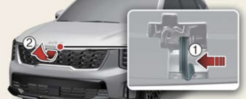 엔진 후드 열림 레버를 당기면 엔진 후드가 열립니다. 차량의 앞에서 엔진 후드를 약간 들어 올리고, 중앙에 위치한 2차 열림 레버 ①을 왼쪽으로 밀고 있는 상태에서 엔진 후드 ②를 위로 들어 올리면 엔진 후드가 열립니다.