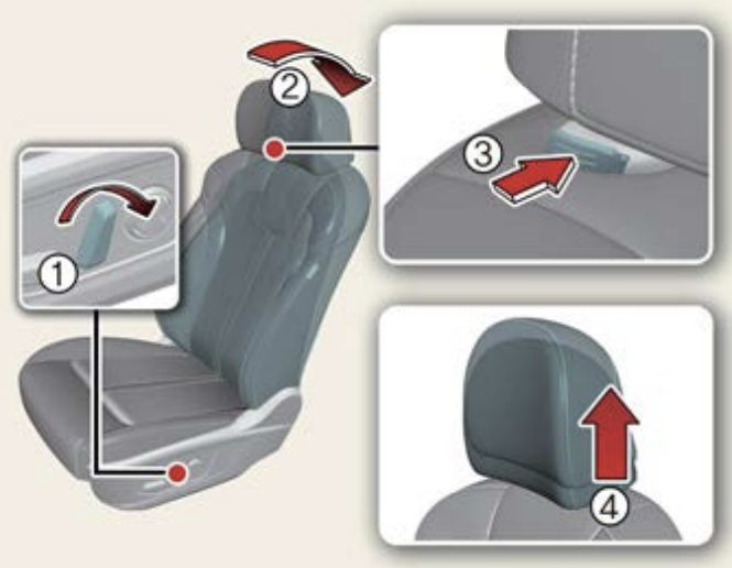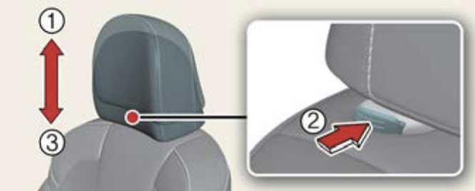 등받이 각도 조절 스위치 ①로 좌석 등받이를 뒤로 젖혀 헤드레스트를 분리할 수 있는 공간을 확보 합니다. 헤드레스트를 끝까지 올린 후 잠금 해제 버튼 ③을 누른 상태에서 헤드레스트를 올려 분리할 수 있습니다.