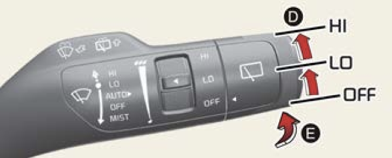 E : 뒷유리 워셔액 분출 및 와이퍼 일시 작동 : 시동 'ON' 또는 시동 상태에서 위치에 따라 다음과 같이 작동합니다.