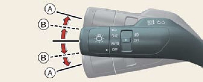 차량의 이동 방향을 예고하기 위해 전조등 스위치를 사용할 수 있습니다. 우측 방향을 표시하려면 조명 스위치를 위 (A)로, 좌측 방향을 표시하려면 아래(A)로 움직이면 됩니다.