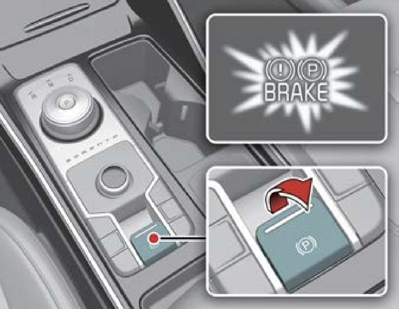차량 주차 시 브레이크 페달을 밟은 상태에서 전자식 파킹 브레이크 스위치를 당기면 전자식 파킹 브레이크가 체결됩니다. 전자식 파킹 브레이크가 정상적으로 체결되면 클러스터에 브레이크 경고등이 켜집니다. 시동이 켜진 상태에서 브레이크를 밟고 전자식 파킹 브레이크 스위치를 눌러 기능을 해제할 수 있습니다.