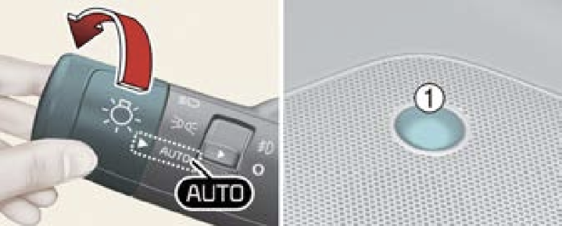 시동이 켜진 상태에서 조명 스위치를 AUTO 위치에 두면 센서 (1)가 외부 밝기(조도)를 감지하여 조명을 켜거나 끕니다.