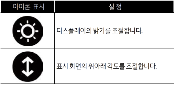 메뉴 버튼(1)을 눌러 디스플레이 밝기와 표시 화면의 위아래 각도를 조절할 수 있습니다. 메뉴 버튼(1)을 반복해서 눌러 조절하려는 항목을 선택할 수 있습니다. 버튼(2) 또는 버튼(3)을 눌러 설정을 변경할 수 있으며, 버튼을 약 5초 이상 사용하지 않으면 아이콘이 사라집니다.