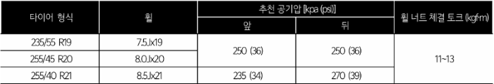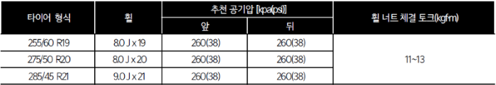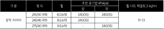 K9은 18인치 및 19인치 휠 & 타이어가 적용됩니다. K9은 휠 크기와 상관없이 앞바퀴 및 뒷바퀴의 공기압은 35 psi가 적정합니다.