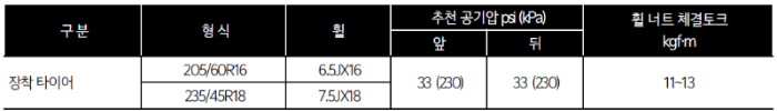 타이어는 차량에 적합한 규격의 타이어를 사용해야 하고, 바닥면과의 접지상태 확인 및 적정 공기압을 유지하는 것이 좋습니다.