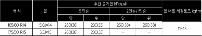 레이는 5인승과 화물용 레이의 공기압은 차이가 있습니다. 승용 RAY는 앞바퀴 적정 공기압은 38 psi이며, 뒷바퀴 적정 공기압은 33 psi입니다. 화물 RAY는 앞바퀴 및 뒷바퀴의 적정 공기압은 38 psi입니다.