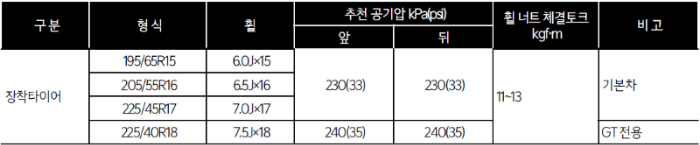 K3는 15인치, 16인치, 17인치, 18인치 4개의 휠 & 타이어가 적용됩니다. 이중 15인치, 16인치, 17인치 휠의 경우 앞바퀴 및 뒷바퀴의 적정 공기압은 33 psi입니다. 가장 큰 18인치 휠은 35 psi가 적정 공기압입니다.