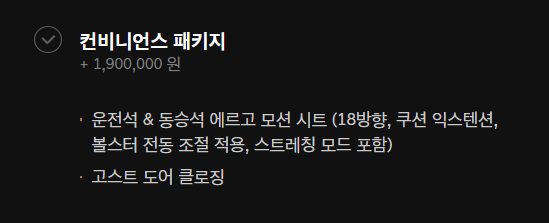컨비니언스 패키지 옵션은 기존 190만 원의 동일한 가격으로 추가 가능합니다. 운전석 & 동승석 에르고 모션 시트, 고스트 도어 클로징 기능 2가지가 추가됩니다.