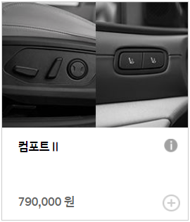 컴포트 옵션은 모던 트림 또는 프리미엄 트림 선택 시 추가 가능합니다. 컴포트 옵션에는 매우 기본적인 시트 편의 기능이 포함됩니다.