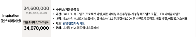 위 이미지와 같이 가솔린 1.6 터보 모델과 터보 하이브리드 모델은 동일한 편의 기능 및 내외장재가 적용됩니다. 하위 H-Pick 트림에서 약 270만 원을 추가하면 구입 가능한 인스퍼레이션 트림은 다양한 내외장재 및 편의 기능이 적용됩니다.