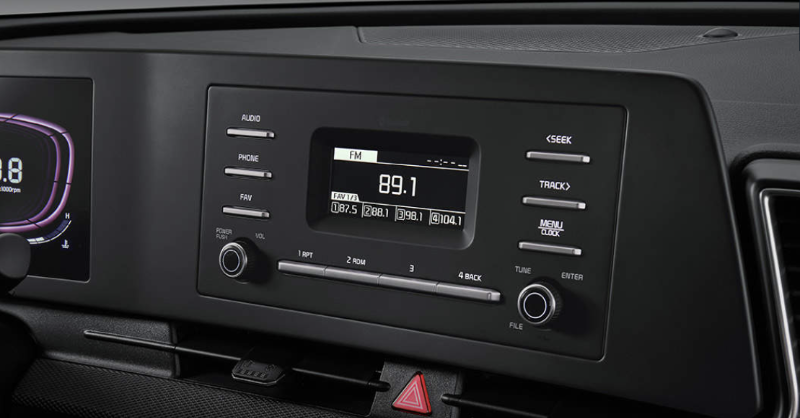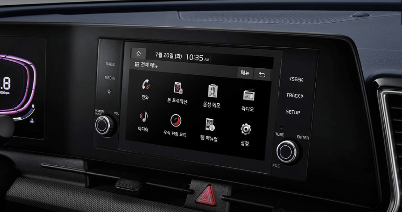 2024 스포티지 프레스티지 트림은 위 사진과 같이 4.2인치 클러스터 및 컴팩트 오디오가 적용됩니다. 클러스터와 내비게이션이 각이 져서 서로 분리되어 있는 것처럼 보입니다.