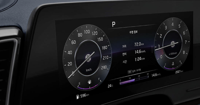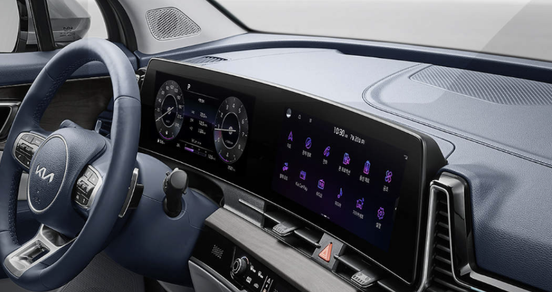 2024 스포티지에 적용되는 파노라믹 커브드 디스플레이는 운전석에 장착된 각종 주행 관련 정보를 제공하는 계기판인 12.3인치의 클러스터와 내비게이션, 음악재생 등의 기능을 이용할 수 있는 인포테인먼트 시스템 화면을 부드러운 곡면으로 연결한 통합형 디스플레이입니다.