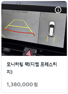모니터핑 팩 옵션은 프레스티지 트림 가솔린 모델은 109만 원, 디젤 모델은 138만 원에 추가할 수 있습니다. 노블레스 및 시그니처 트림 가솔린 모델은 69만 원, 디젤 모델 99만 원에 추가할 수 있습니다.