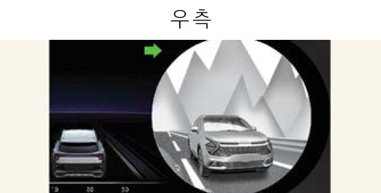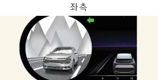 후측방 모니터는 방향지시등 스위치를 조작하면 해당 방향의 후측방 영상이 클러스터에 표시되는 기능입니다. 주행 중 차로 변경 시 해당 방향의 영상을 클러스터에 표시하여 후측방 사각지대의 차량을 화면으로 확인할 수 있습니다.