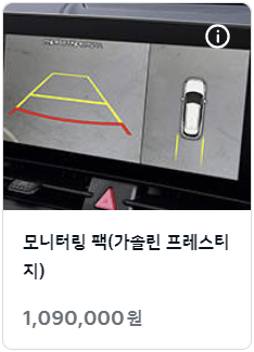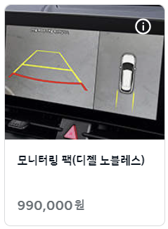 모니터링 옵션을 추가하면 서라운드 뷰 모니터, 후측방 모니터, 리모트 360도 뷰(내 차 주변 영상), 후방 주차 충돌방지 보조, 원격 스마트 주차 보조, 측방 주차 거리 경고 기능이 추가 적용됩니다.
