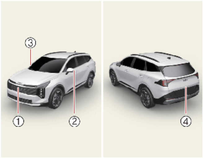 위 사진을 보면 ① 전방 카메라, ② 좌측방 카메라(실외 미러 하단), ③ 우측방 카메라(실외 미러 하단), ④ 후방 카메라의 위치를 확인할 수 있습니다.