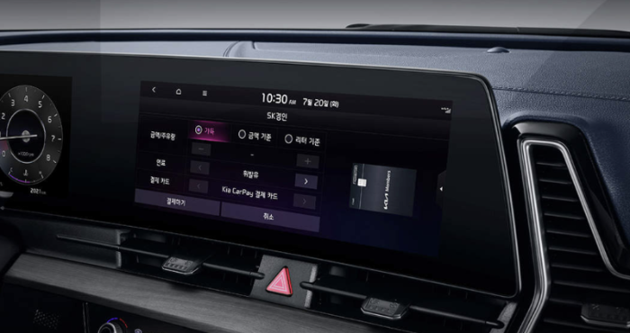 음성인식 서비스를 통해 내비게이션 목적지 설정 등 다양한 기능을 수행할 수 있으며, 기아 카페이 기능을 활용하여 주유소 등 다양한 곳에서 터치만으로 요금을 결제할 수 있는 편의 기능이 적용됩니다.