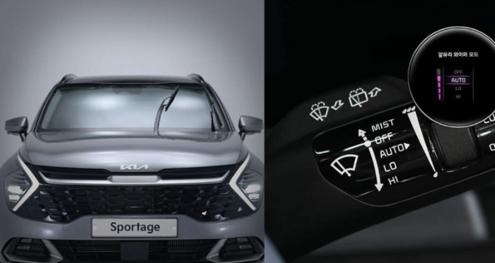 스포티지 최하위 프레스티지 트림에서 12.3인치 내비게이션 옵션을 추가하면 레인센서가 적용됩니다. 차내 중앙 앞 유리 상단에 설치된 센서에서 비의 양을 감지하여 비의 양이 많아지면 와이퍼 작동 속도가 빨라지고, 비의 양이 적어지면 느려지다가 비가 멈추면 작동도 멈춥니다.