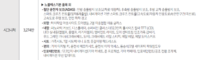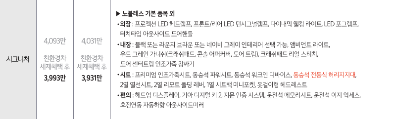 노블레스 트림에서 약 270만 원을 추가하면 시그니처 트림을 선택할 수 있습니다. 270만 원으로 위의 사진과 같이 매우 다양한 기능들을 추가할 수 있습니다.