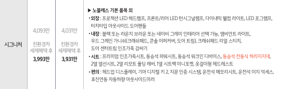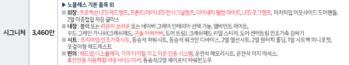 최상위 시그니처 트림의 경우 내외장재만 추가하는 것이 아니라 다양한 편의 기능이 추가적으로 적용됩니다. 노블레스 트림에서 261만 원을 추가하면 구입 가능합니다. 비교적 저렴한 가격에 최상위 트림을 구입할 수 있기 때문에 노블레스 트림 구입을 고려하고 있다면 시그니처 트림 구입도 고민해 볼 필요가 있습니다.