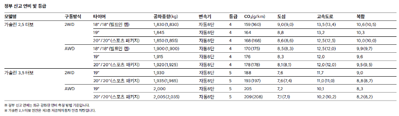 AWD 시스템이 추가되며 차량의 무게 약 70kg 증가하기 때문에 차량을 움직이는데 연료 소모가 많아집니다. 또한 4개의 바퀴에 동력을 전달해야 하기 때문에 2WD에 비해 연비가 0.7km/ℓ 낮습니다.