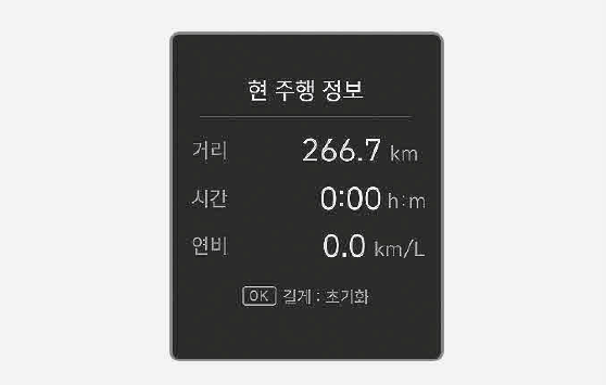 유틸리티 정보를 전환하려면 레버를 위나 아래로 밀면 됩니다. 유틸리티 정보는 현 주행 정보, 주유 후 정보, 누적 정보, 타이어 공기압, 사륜 구동 배분(4WD 옵션 선택 시) 정보가 표시됩니다.