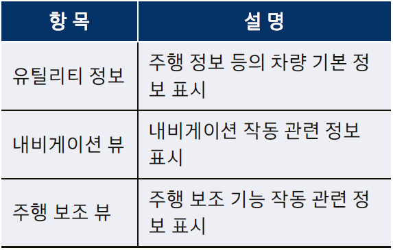 클러스터 표시창에는 유틸리티 정보, 내비게이션 뷰, 주행 보조 뷰를 표시할 수 있습니다.