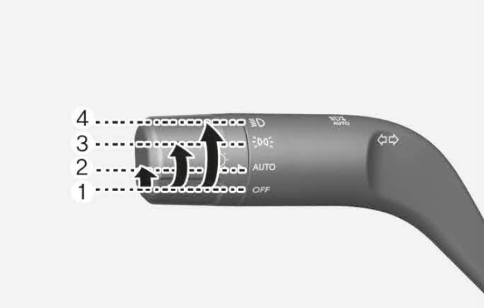 조명 스위치의 끝을 잡고 돌려 조명을 켜거나 끌 수 있습니다. 조명 스위치는 순서대로 ① OFF 조명 꺼짐 ② AUTO 자동 켜짐 ③ 미등 켜짐 ④ 전조등 켜짐 기능을 수행합니다.