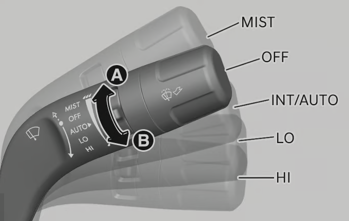 시동이 켜진 상태에서 와이퍼 스위치 위치에 따라 작동됩니다. A 방향으로 올리면 와이퍼의 민감도가 증대되어 빠르게 움직입니다. B 방향으로 내리면 와이퍼의 민감도가 감소되어 천천히 움직입니다.