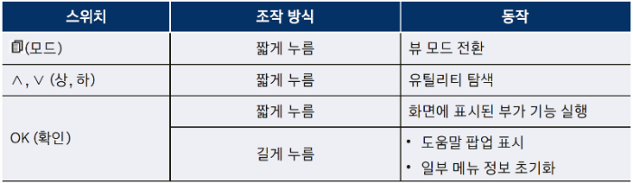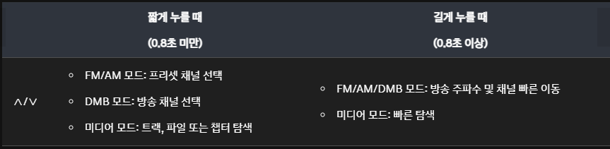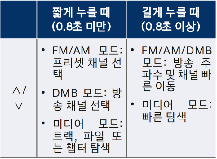 버튼을 위 아래로 움직여 여러 가지 기능을 수행할 수 있습니다. 라디오, 미디어 감상 중 버튼을 움직여 파일을 변경할 수 있습니다.