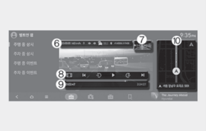 ⑩ 녹화 위치 : 내비게이션 지도상에 영상이 녹 화된 위치를 표시, 터치하여 원하는 위치로 이동