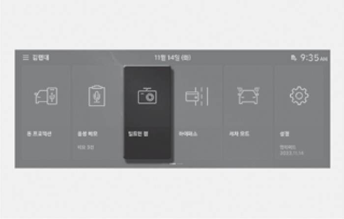 인포테인먼트 시스템 홈 화면에서 빌트인 캠을 선택하여 빌트인 캠과 관련된 모든 것을 확인할 수 있습니다. 빌트인 캠 메뉴를 사용 중에는 녹화 기능이 작동하지 않습니다.