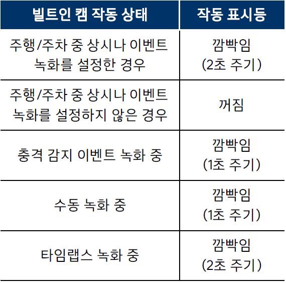 전방 및 후방 카메라에 있는 표시등을 통해 빌트인캠 작동 상태를 확인할 수 있습니다. 2초 주기로 깜빡일 경우 주행 / 주차 중 상시나 이벤트 녹화를 설정한 경우이며, 작동 표시등이 꺼져있을 경우에는 주행 / 주차 중 상시나 이벤트 녹화를 설정하지 않은 경우입니다.