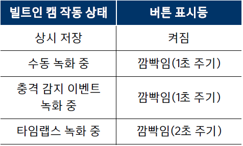 녹화 버튼에 있는 표시등을 통해 빌트인 캠의 작동 상태를 확인할 수 있습니다. 버튼 표시등이 켜져 있으며 상시 저장 중인 상태이며, 1초 주기로 깜빡일 경우 수동 녹화 또는 충격 감지 이벤트 녹화 상태인 것을 알 수 있습니다. 2초 주기로 표시등이 깜빡일 경우 타임랩스 녹화 상태입니다.