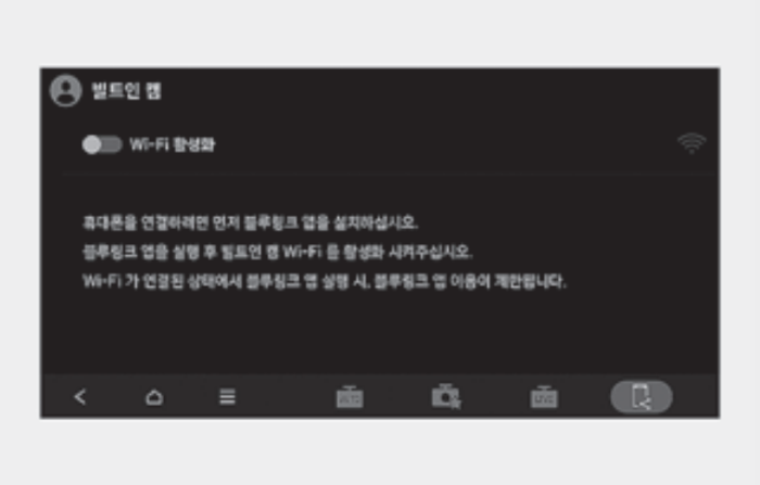 2. 빌트인 캠 화면의 휴대폰 연결 메뉴에서 Wi-Fi 활성화를 선택하여 연결이 가능한 상태로 만드십시오.
