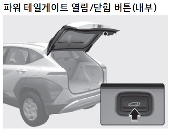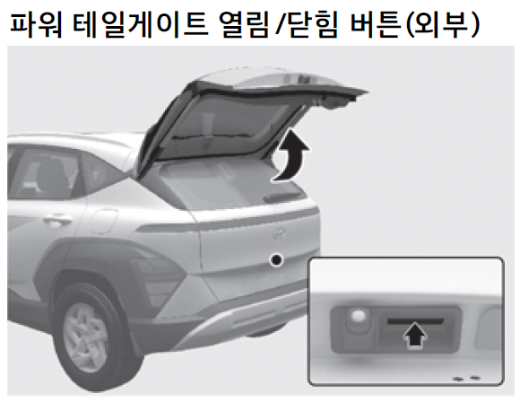 테일게이트가 열린 상태에서 테일게이트 하부에 위치한 버튼을 누르면 경고음과 함께 테일게이트가 닫힙니다.