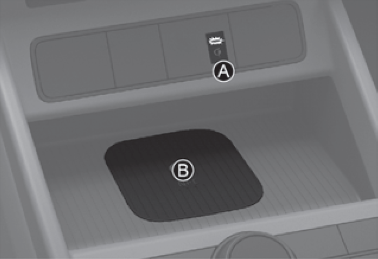 별도의 케이블 없이 무선으로 고속 충전이 가능하며 하차 시 휴대폰 방치 알림 기능으로 편의성을 향상시켰습니다. 스마트폰을 충전 패드 위에 올려놓으면 충전이 시작됩니다. 충전이 시작되면 A에 표시등이 들어옵니다.
