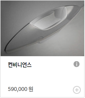 | 컨비니언스 옵션 | 프리미엄 트림 | 59만 원 | 스마트 파워 테일게이트 스마트폰 무선 충전 디지털 키 2 터치 도어 포켓 라이팅(1열) 터치타입 아웃사이드 도어 핸들 |
