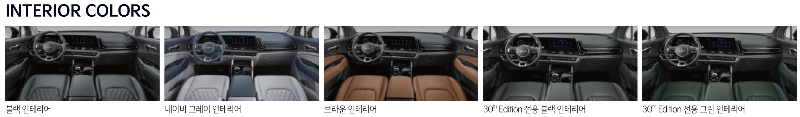 | 내장 인테리어 색상 | 블랙 | 블랙, 네이비 그레이, 브라운 | 블랙, 그린 |
