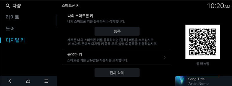 차량 인포테인먼트 화면에서에서 설정 → 차량 → 디지털 키 → 나의 스마트폰 키 → 등록을 눌러 디지털 키를 등록할 수 있습니다.