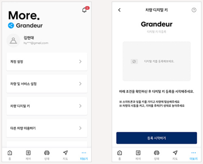 설치 후 회원 가입 및 차량을 등록을 누르며, 스마트폰을 차량 내 무선 충전 패드에 거치합니다. 이 상태에서 차량의 인포테인먼트 화면에서 설정 → 차량 → 디지털 키 → 나의 스마트폰 키 → 등록 버튼을 눌러 등록을 시작합니다.
