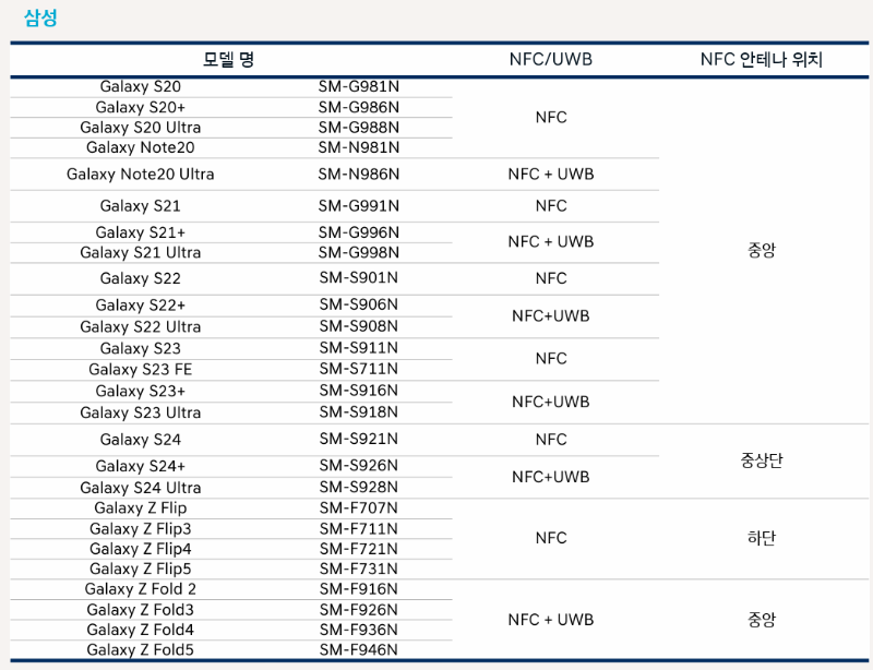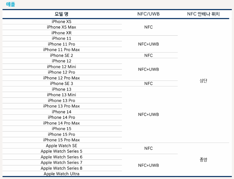 위 표에서 확인할 수 있듯이 최신 및 고사양의 기기에서는 UWB 기능이 적용됩니다. UWB 기능은 광역 통신 기능으로 스마트폰을 무선 충전 패드 또는 손잡이에 스마트폰을 터치하지 않아도 차량의 시동 및 도어 통제가 가능합니다.
