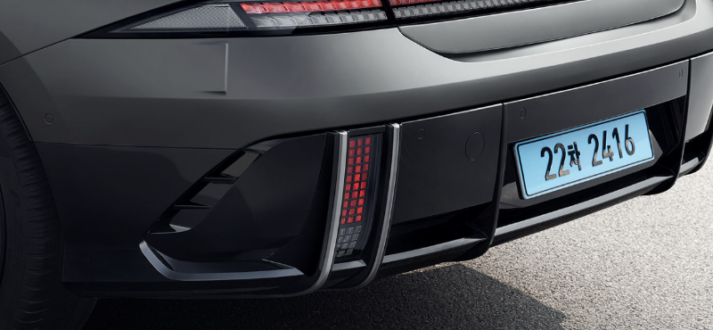 또한 블랙 에디션 모델은 리어 범퍼 하단 몰딩에 블랙 하이그로시 외장재가 적용됩니다. 위 사진에서 볼 수 있듯이 기존 아이오닉 6 모델의 리어 범퍼 하단은 메탈 소재의 외장재가 적용됩니다.