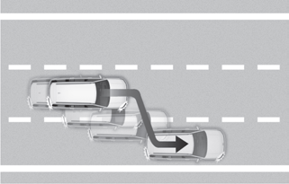 차로를 정상 주행하고 있을 때 옆 차로에서 근접하는 차량이 있을 경우 추가된 전측방 레이더가 이를 인식하여 차로 내에서 반대 방향으로 편향하여 주행하도록 돕습니다. 만약 양 옆의 차로에 근접 차량이 있으면 편향하여 주행하지 않고 가운데를 주행하게 됩니다.